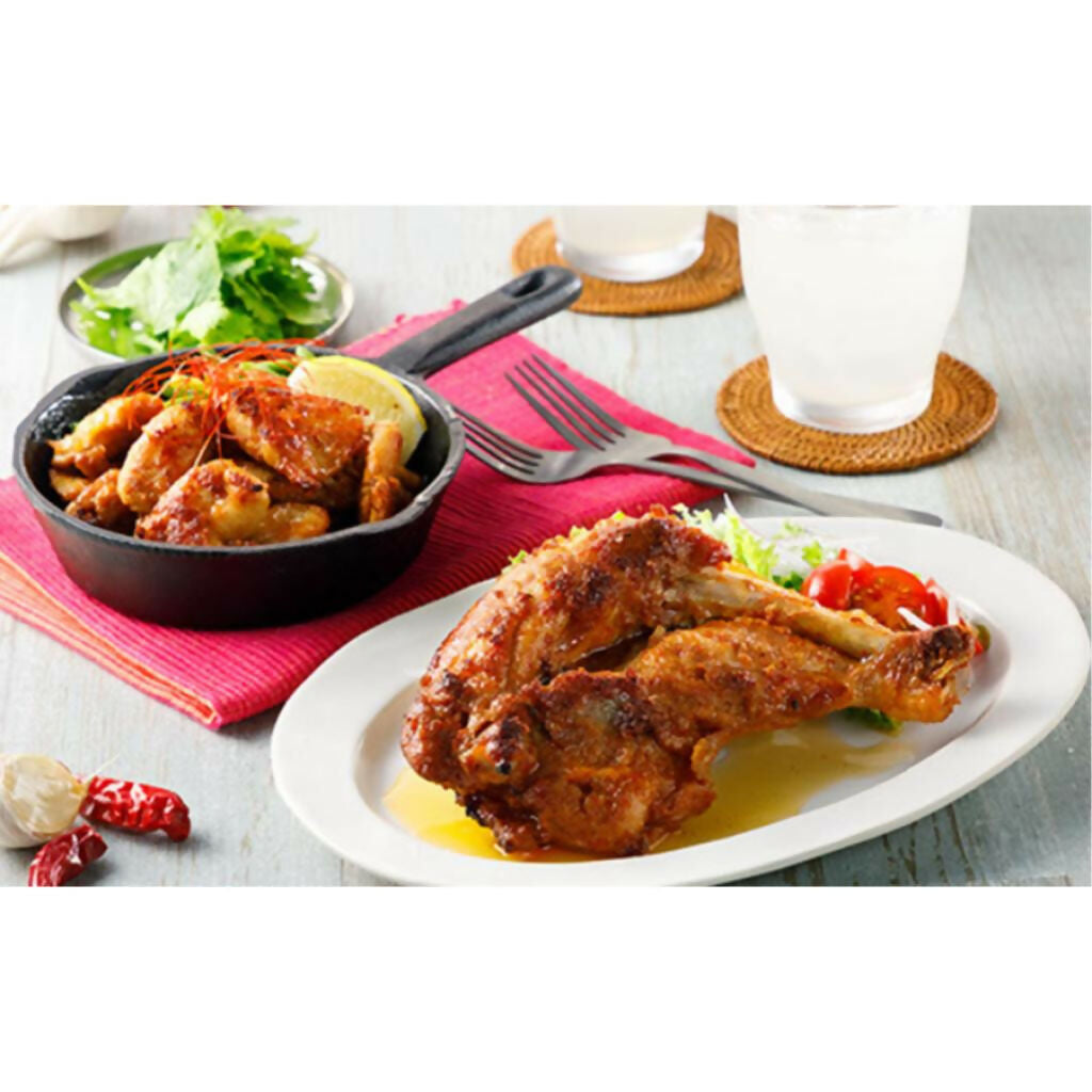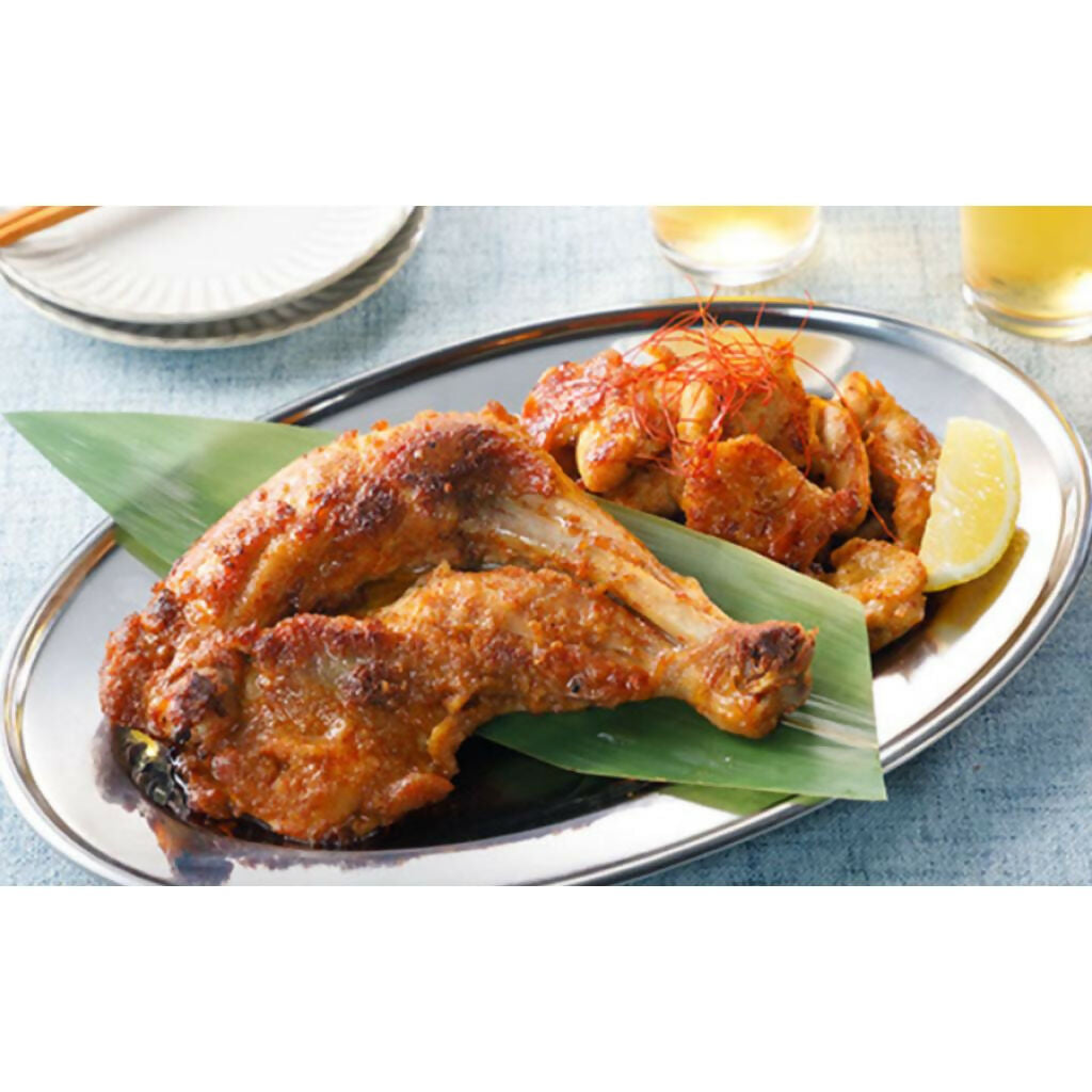 ●味付けした骨付鶏を、鶏の旨みがたっぷり詰まったチキンオイルで焼き、真空パックしたさぬき骨付鶏。焼き立てを真空パックにすることで、鶏全体に味が染み込んでいます。