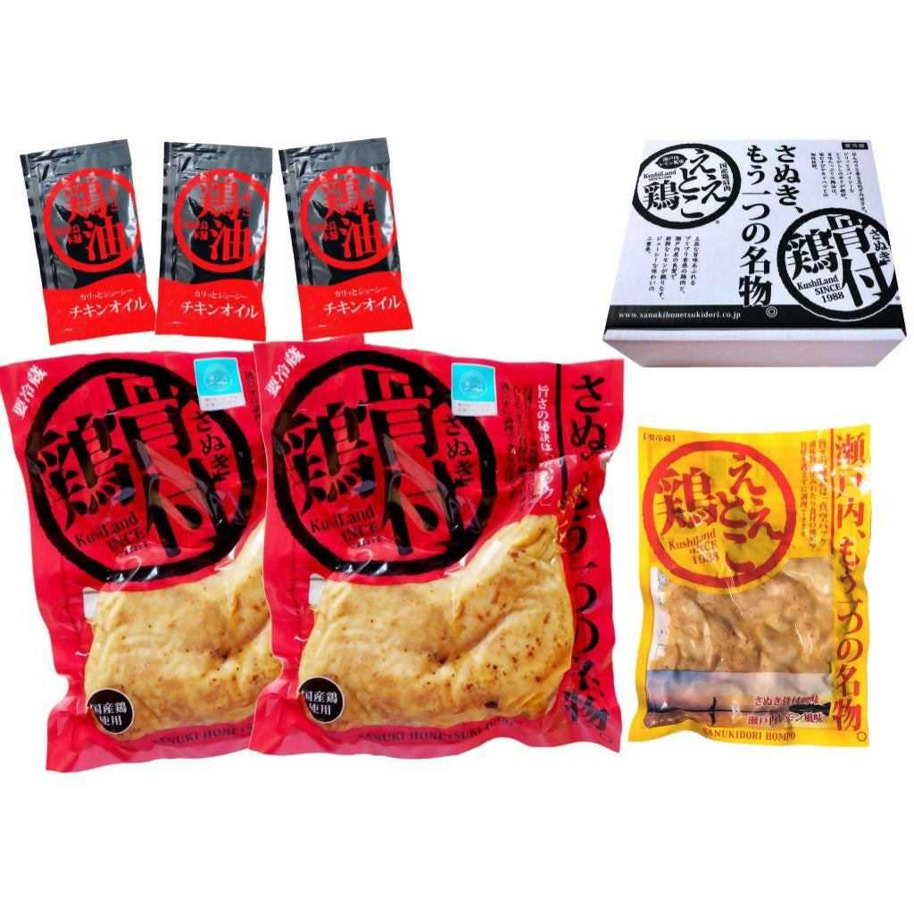 ●骨付鶏が2本に、ええとこ鶏1袋、そして鶏の旨みを閉じ込めた純正チキンオイルが3袋ついたギフトセットです。